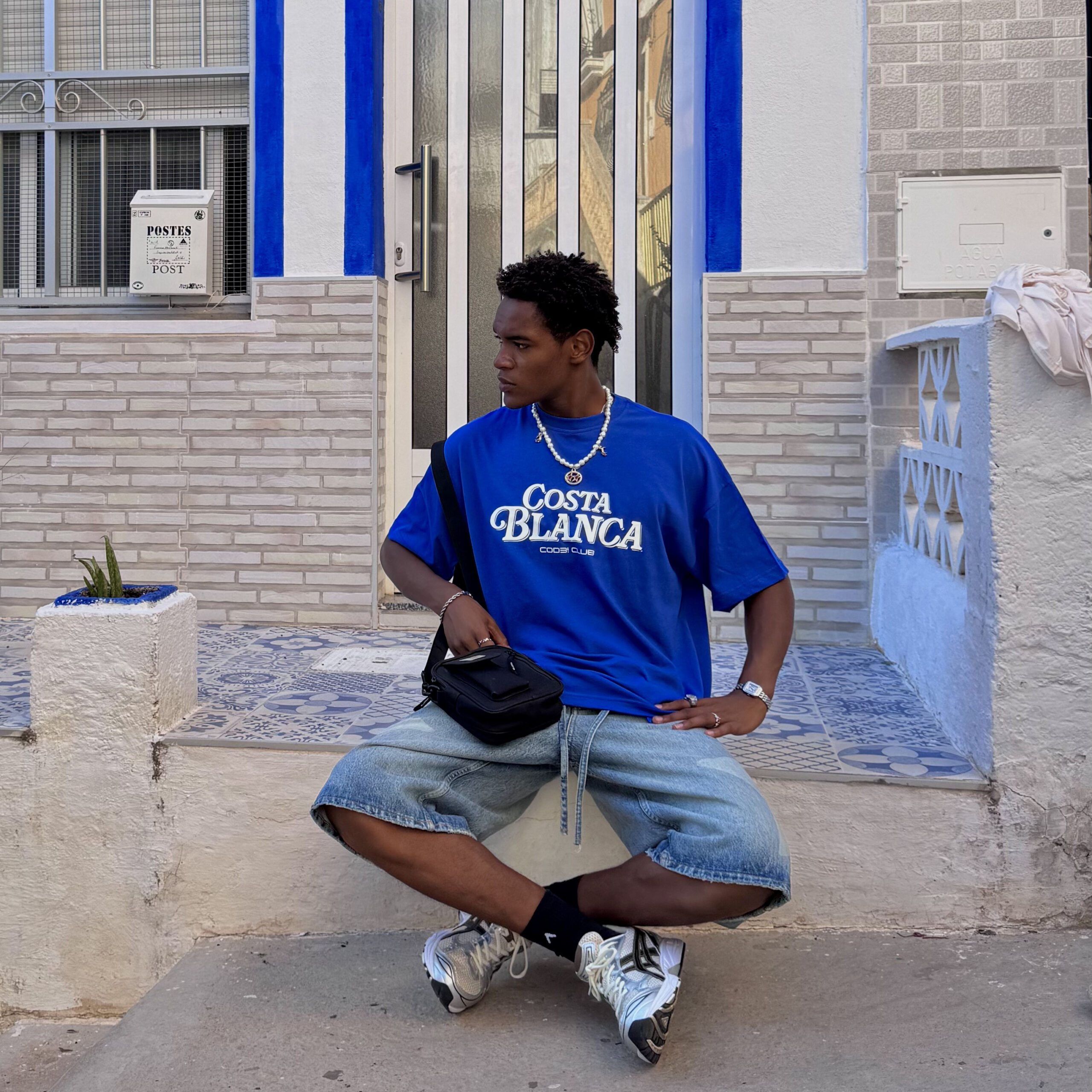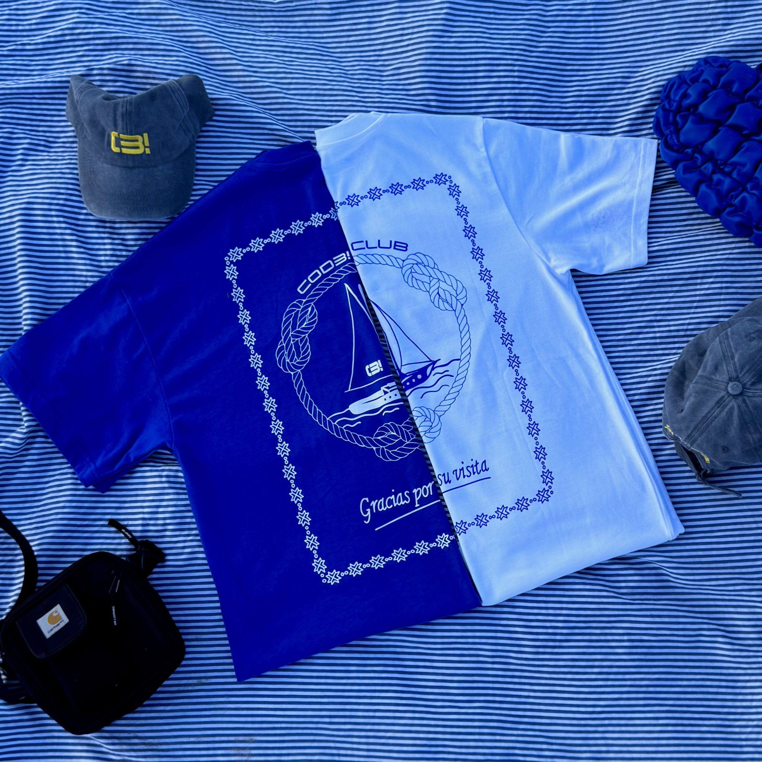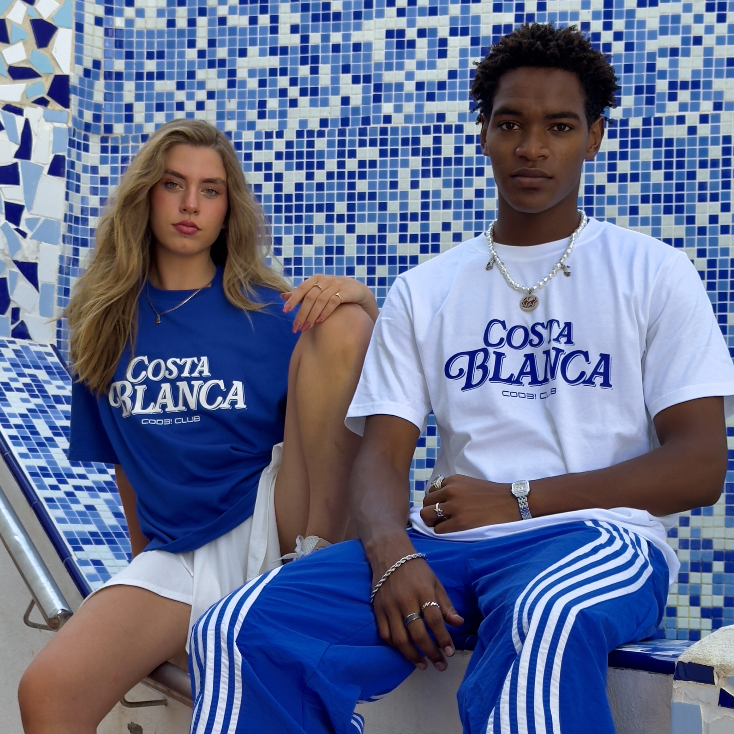Camiseta veraniega disponible en blanco y azul, jugando con el contraste entre ambos colores en cada versión. Parte delantera minimalista con el texto de «COSTA BLANCA» y la parte trasera simula una servilleta de bar con la frase “Gracias por su visita”, aportando un guiño gracioso y original típico de los bares locales.